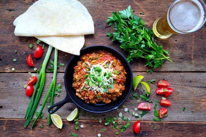 Haricot blanc (chlorure de calcium, EDTA disodique), tomate, bœuf haché, oignon, sauce tomate (purée de tomates (pâte de tomates), acide citrique, épice, huile de coton, arôme), maïs en grain (maïs, sucre, amidon de maïs modifié), consommé de bœuf (eau, bouillon de bœuf, extrait de levure, protéines hydrolysées (levure, protéines hydrolysées (levure, blé, soya), glutamate monosodique, dextrose, caramel, saveur (extraits de céleri)), piment rouge et vert, huile de canola, épices (sel, ail en poudre, bioxyde de silicium, épices, herbes, sel d'oignon, poivre, piment), ail.Allergènes: blé, soya.